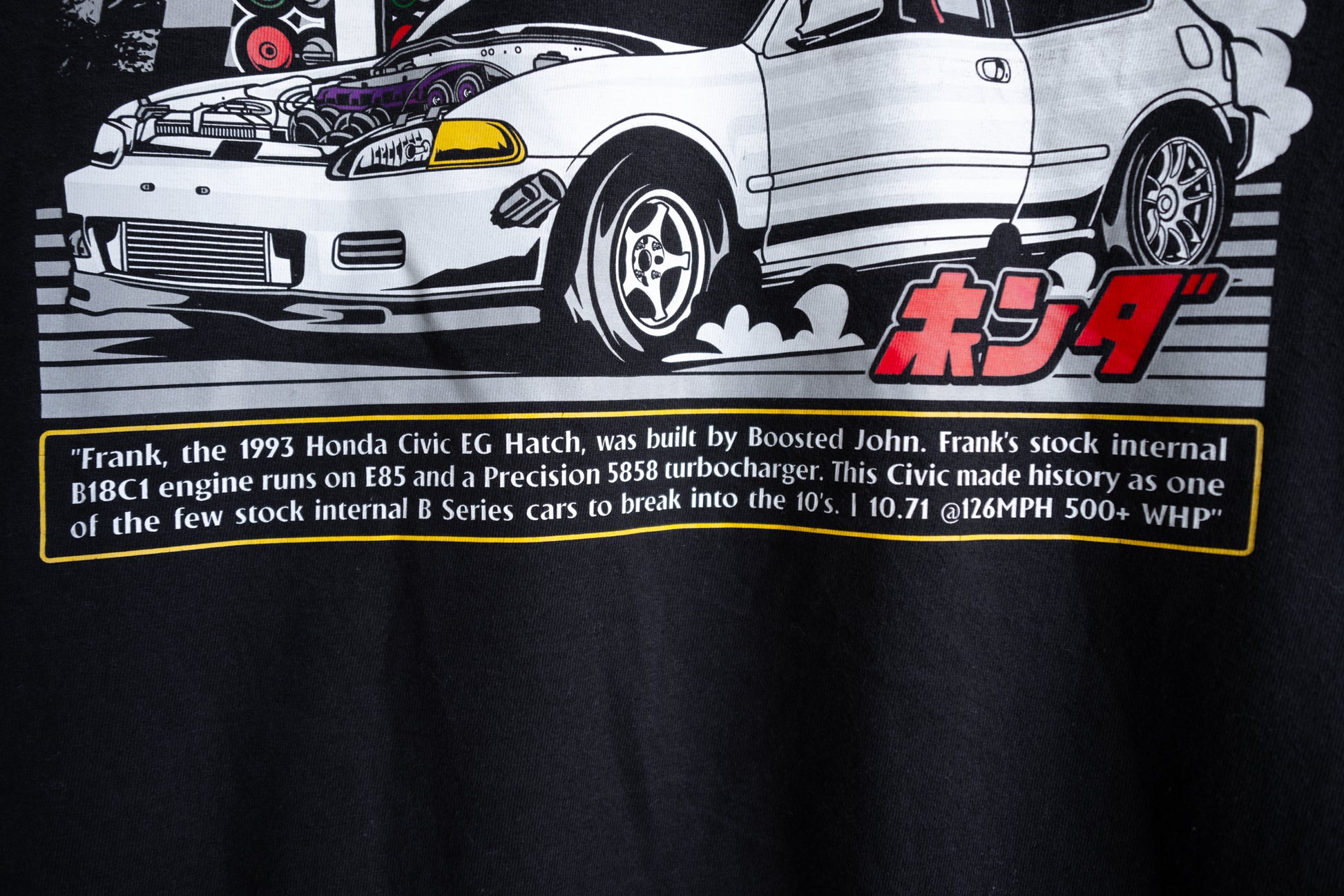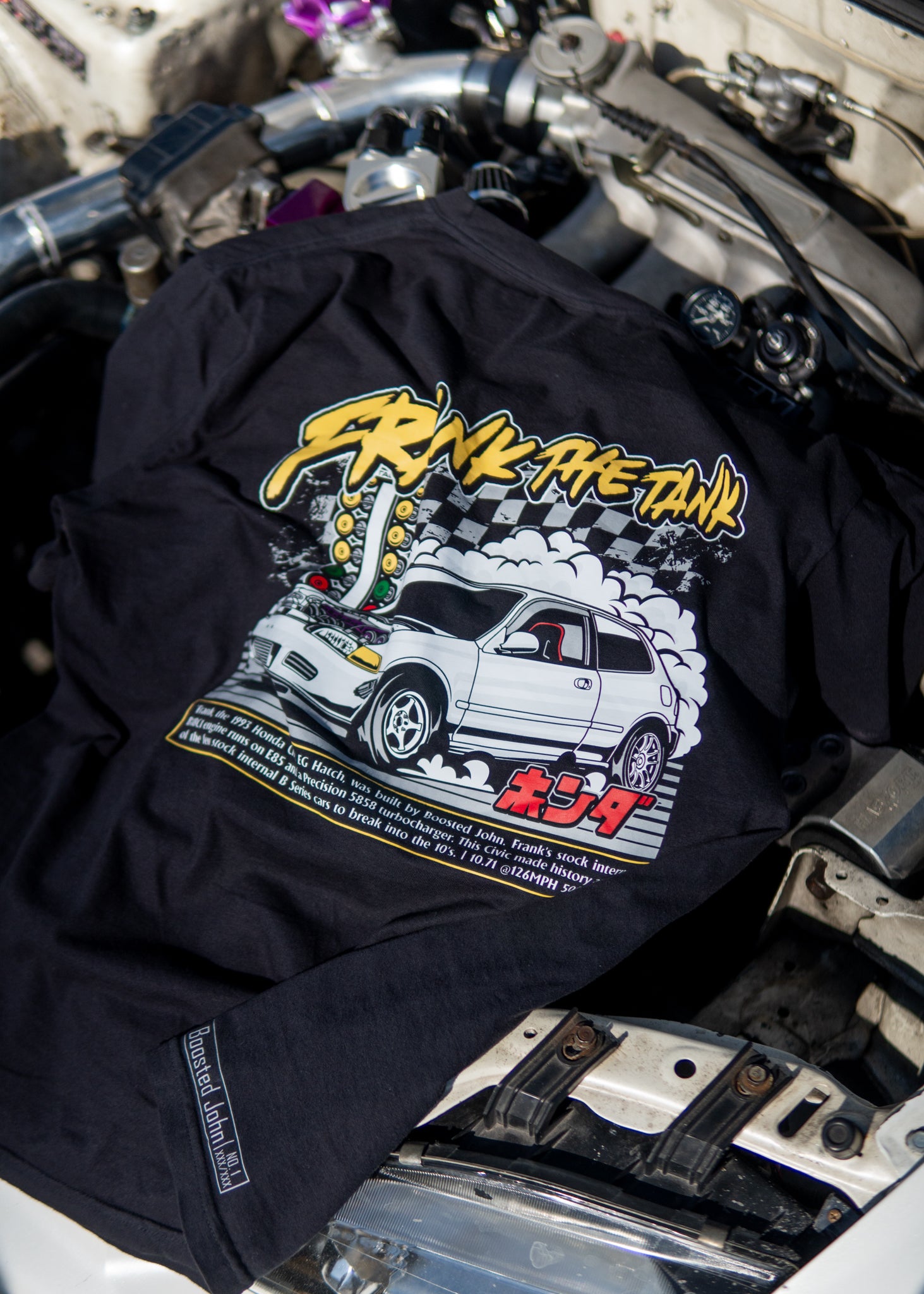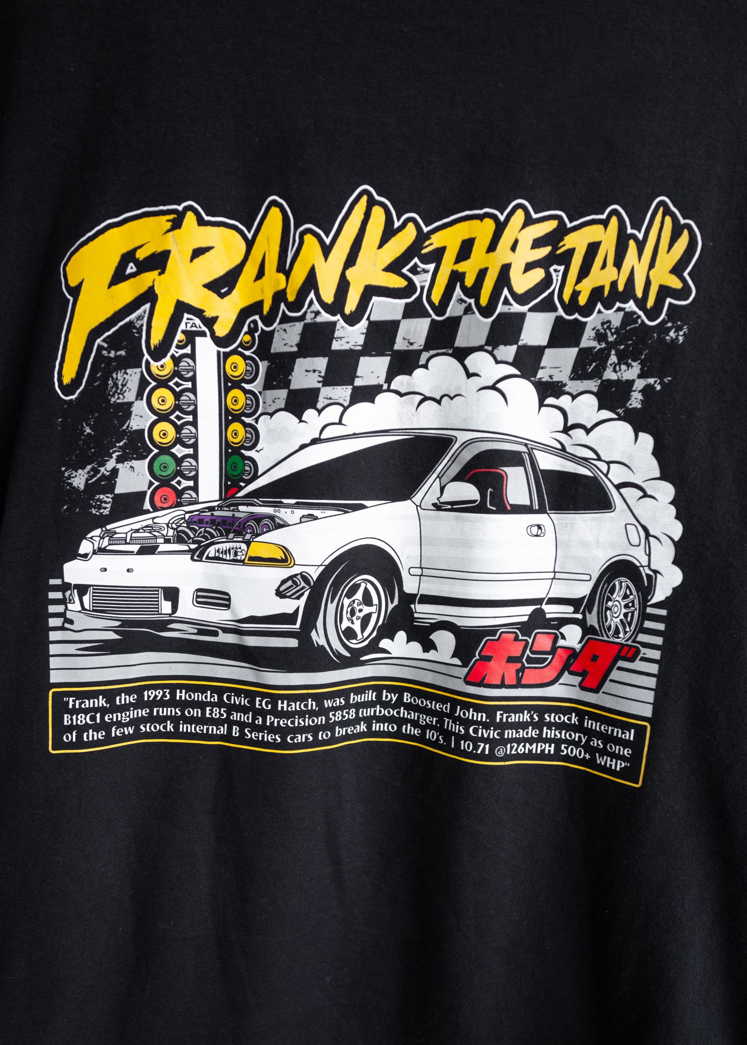 “Frank the Tank is a 1993 Honda Civic EG Hatch built by Boosted John. Frank features a B18C1 GSR engine with bone stock internals. With the addition of E85 and the Precision 5858 turbocharger, Frank has made history as one of the few stock internal B Series cars to have broken into the 10’s.